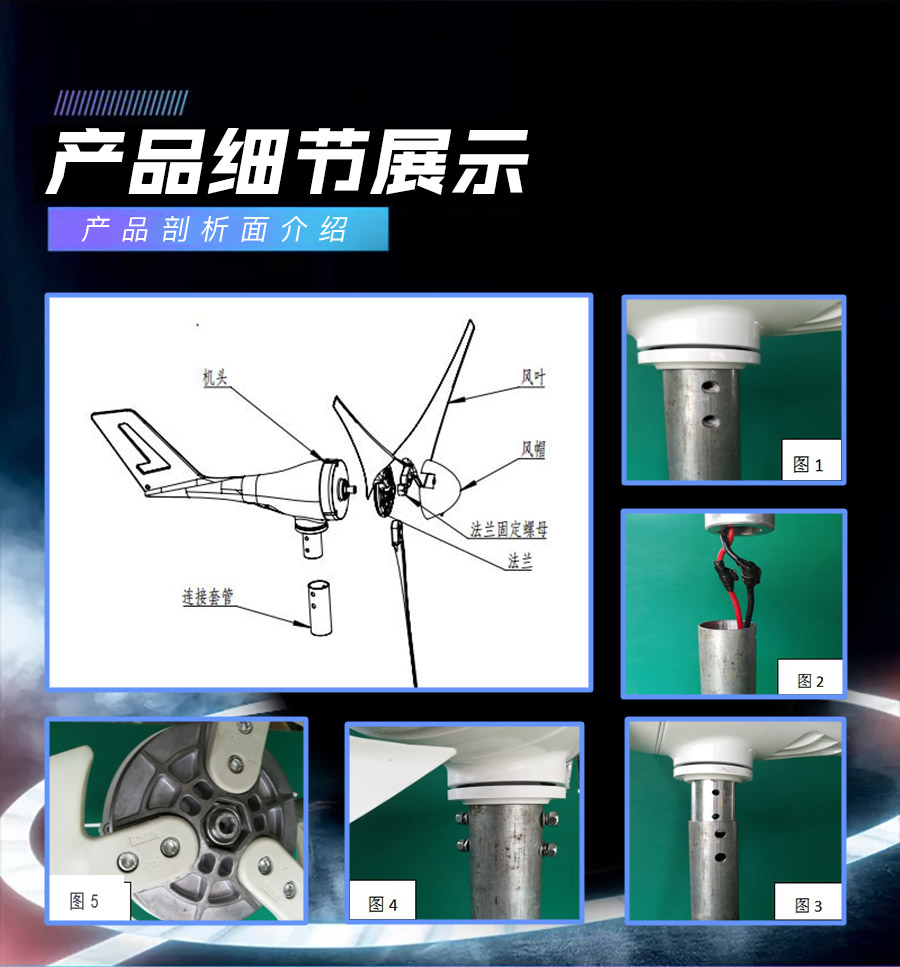 3、風(fēng)葉采用高強(qiáng)度復(fù)合材料,強(qiáng)度高,韌性好,防紫外線,防腐蝕,抗大風(fēng),具有良好的氣動性能。