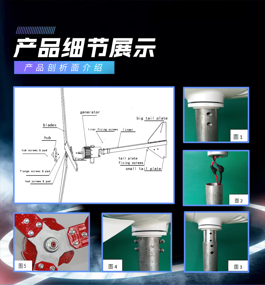 6、獨特的尾舵預(yù)偏設(shè)計,自動精確對準(zhǔn)迎風(fēng)方向,提高輸出功率同時兼顧調(diào)整和強風(fēng)保護。